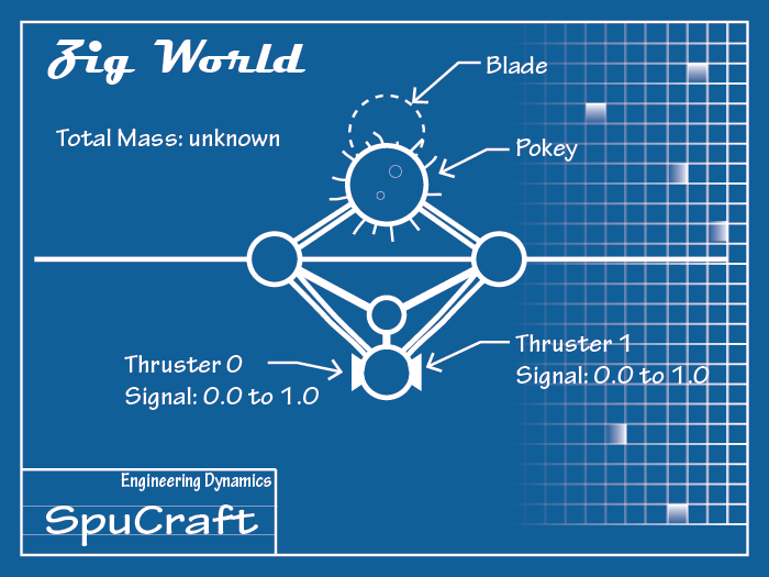 Here is the spuCraft that you will pilot in the Zig World. You can click on it to get a bigger view. The diagram labels the thrusters and specifies the thruster signal ranges.